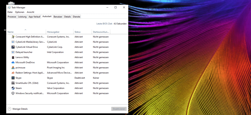 Dieses Problem lässt sich glücklicherweise mit wenigen Klicks angehen: Öffnen Sie den Windows-eigenen Taskmanager, aktivieren Sie die erweitere Ansicht und wählen Sie dann den Reiter Autostart. Hier sehen Sie in einer Übersicht, die beim Hochfahren automatisch startenden Programme, außerdem erfahren Sie in der Spalte Startauswirkungen, wie stark das Programm den Start Ihres Betriebssystems beeinflusst. Nach einem Rechtsklick auf ein Autostart-Programm können Sie das automatische Mitstarten deaktivieren.