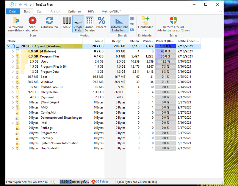 Besonders große Dateien, die Sie nicht mehr benötigen, nehmen Speicherplatz auf der Festplatte ein, den Sie sicherlich für wichtigere Daten nutzen könnten. Mit Tools wie Treesize Free oder WinDirStat lassen sich große Dateien schnell und einfach aufspüren, unerwünschter Datenmüll ganz einfach löschen.