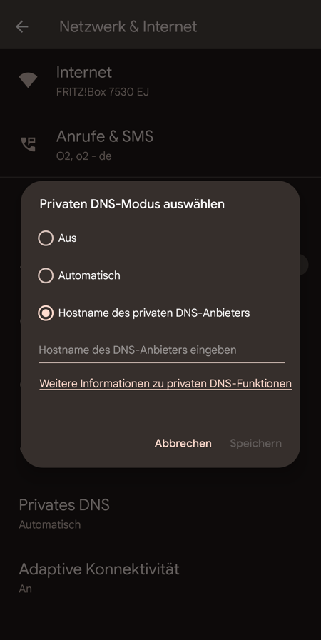 3. Im sodann geöffneten Menü wählen Sie den Eintrag Privates DNS aus und tippen im Konfigurationsdialog auf die Option HOstname des privaten DNS-Anbieters. Beachten Sie dabei bitte, dass Google seit Android 9 ausschließlich DNS over TLS-Dienste unterstützt, die eine verschlüsselte DNS-Abfrage ermöglichen. Dienste, die diese Verschlüsselung nicht unterstützen, können daher nicht mit Android genutzt werden.