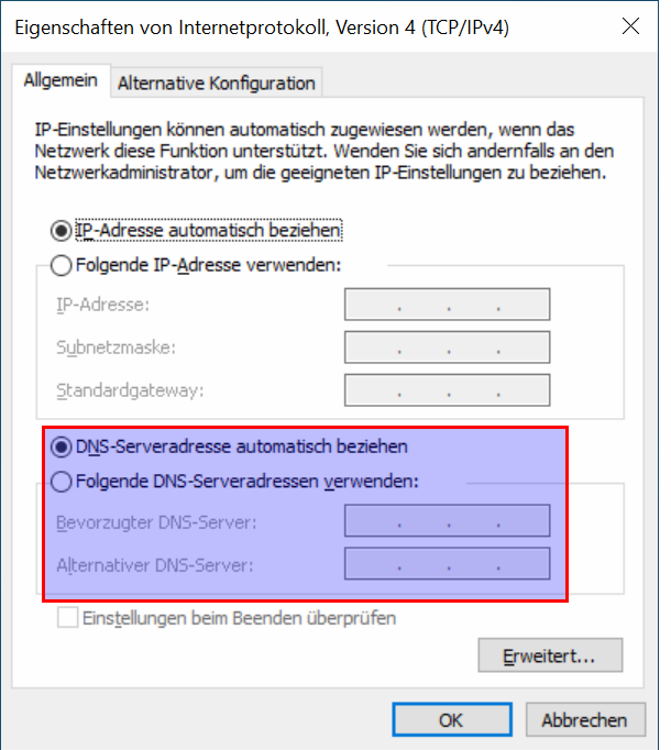 5. Geben Sie im nun geöffneten Dialog in den Feldern Bevorzugter DNS-Server und Alternativer DNS-Server die IP-Adressen der gewünschten DNS-Server ein.