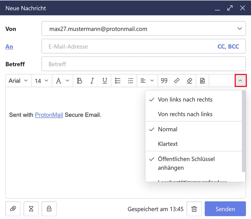 Um eine PGP-verschlüsselte Nachricht an einen anderen (Nicht-ProtonMail-)PGP Nutzer zu schicken, klicken Sie auf Neue Nachricht und anschließend auf den Chevron ganz rechts auf der Leiste mit den Formatierungssymbolen. Wählen Sie Öffentlichen Schlüssel anhängen aus. So teilen Sie Ihren Public Key mit den Empfängern Ihrer Nachricht.