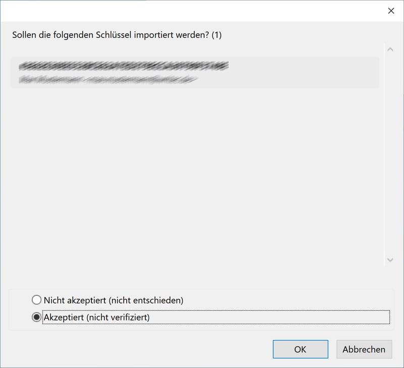 Wenn Sie hingegen einen Public Key per Mail erhalten, dann klicken Sie mit der rechten Maustaste auf den asc-Anhang und wählen OpenPGP-Schlüssel importieren aus. Thunderbird fragt Sie nun, ob Sie den Schlüssel importieren wollen. Wenn ja, dann klicken Sie auf Akzeptiert (nicht verifiziert).
