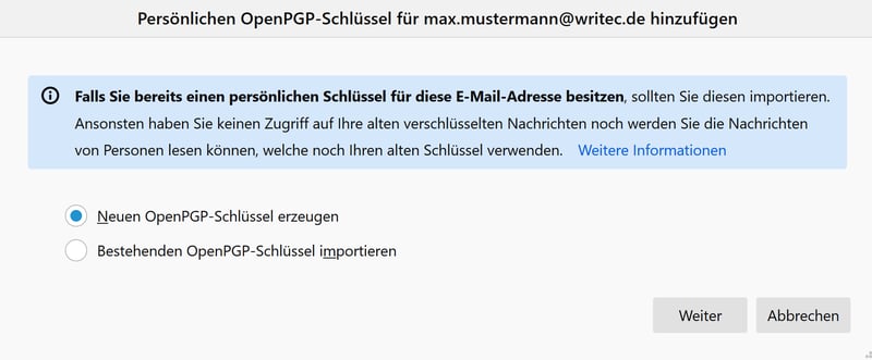 Sie können entweder ein bereits bestehendes Schlüsselpaar hinzufügen oder ein neues generieren. Wenn Sie ein neues Paar brauchen, wählen Sie entsprechend Neuen OpenPGP-Schlüssel erzeugen aus und klicken auf Weiter.