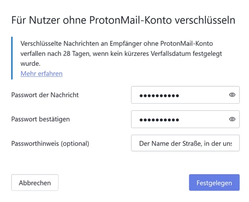 Wenn Sie eine verschlüsselte Nachricht an Nicht-ProtonMail-Kunden senden, dann klicken Sie im Nachrichtenfenster auf das Schloss-Symbol (grün markiert im Bild oben). Es öffnet sich das Pop-up Für Nutzer ohne ProtonMail-Konto verschlüsseln. Geben Sie ein Passwort ein, bestätigen Sie es und ergänzen Sie optional einen Passworthinweis. Klicken Sie auf Festlegen und anschließend auf Senden.