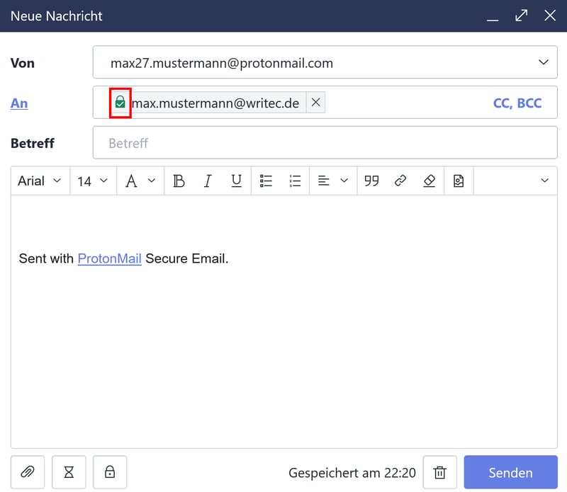 Dass Sie eine E-Mail an einen Kontakt senden, dessen Public Key Sie importiert haben, erkennen Sie an dem grünen Schloss in der Empfängerzeile.