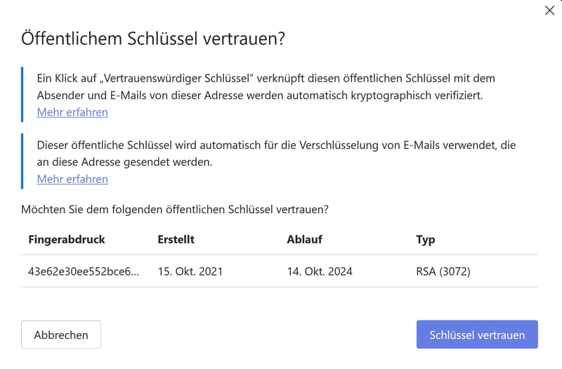 Wenn Ihnen jemand seinen Public Key schickt, klicken Sie in der E-Mail auf Schlüssel vertrauen. Nun fragt Sie ein Pop-up, ob Sie diesen Key als vertrauenswürdig erachten. Wenn ja, dann klicken Sie auf Schlüssel vertrauen.
