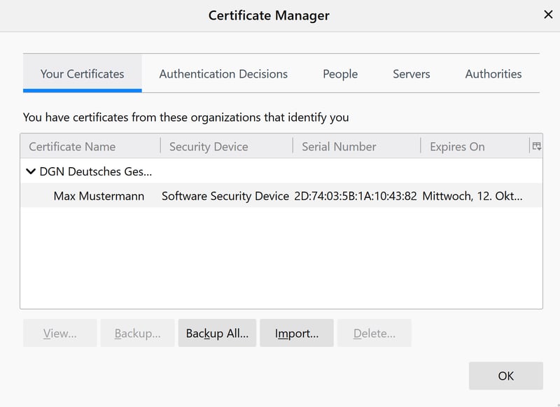Wenn alles geklappt, wird das importierte Zertifikat angezeigt. Klicken Sie anschließend auf OK.