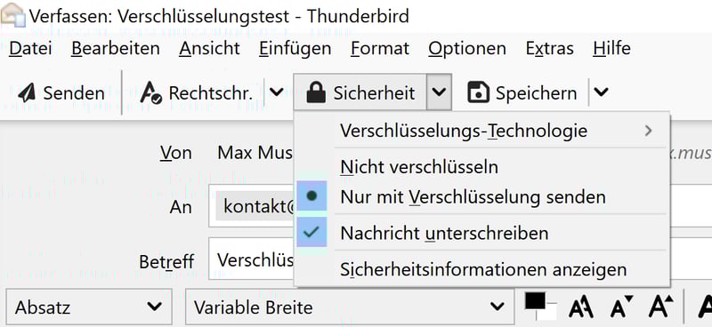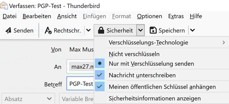 Wählen Sie Nur mit Verschlüsselung senden und optional Nachricht unterschreiben oder Meinen öffentlichen Schlüssel anhängen aus. Anschließend Senden Sie die Nachricht.