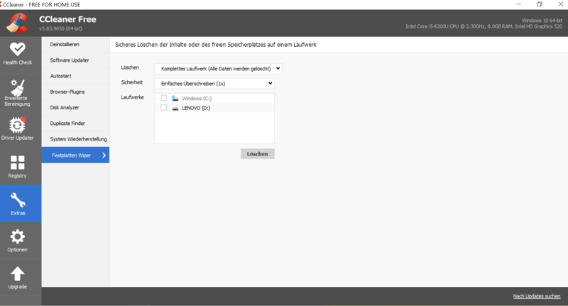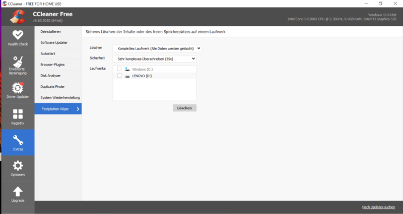 Die Funktion "Festplatten Wiper" versteckt sich in den Extras.