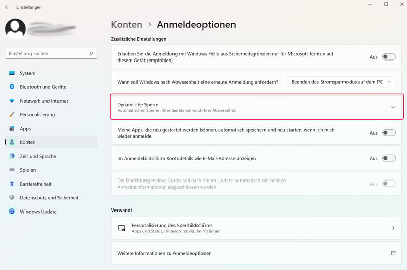 Windows verfügt zusätzlich über die Funktion Dynamische Sperre, mit der mobile Endgeräte wie Smartphones, Tablets oder Smartwatches per Bluetooth mit dem Computer gekoppelt werden können. Mit der dynamischen Sperre lässt sich das System so konfigurieren, dass der Computer automatisch gesperrt wird, sobald sich das jeweilige Endgerät nicht mehr in Reichweite befindet.