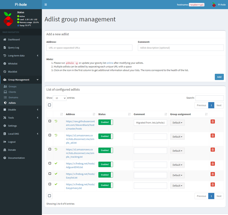Zusätzliche Filterlisten können Sie über die Kategorie Group Management aktivieren, indem Sie dort die Auswahl Adlists anklicken und dann im rechten Bereich des Fensters die entsprechenden Listen angeben. Verschiedene Filterlisten finden Sie im Internet beispielsweise bei https://firebog.net.
