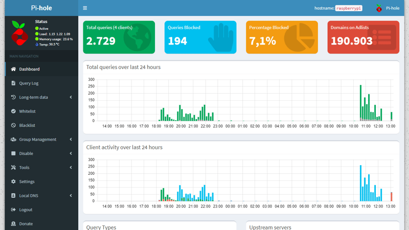 Um nachträgliche Modifikationen an der Konfiguration vorzunehmen, rufen Sie im Webbrowser eines beliebigen Clients entweder die IP-Adresse Ihres Pi-hole-Systems, gefolgt von der Sequenz /admin auf, oder geben die Adresse http://pi-hole/admin ein.