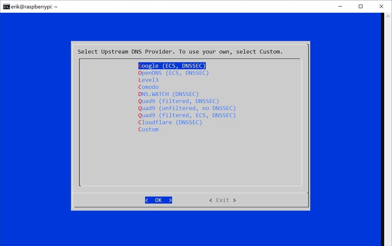 Anschließend wählen Sie aus einer Liste den öffentlichen DNS-Anbieter aus, an die das Pi-hole-System Anfragen der Clients im Intranet weiterleitet.