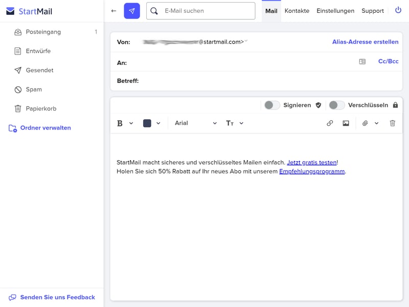 Startmail* bietet Ende-zu-Ende-Verschlüsselung mit PGP. Falls Sie eine E-Mail an einen Empfänger senden, der keine Verschlüsselung verwendet, können Sie sie mit einem Passwort absichern. Außerdem können Sie Ihre E-Mail signieren, um den Empfängern die Echtheit Ihrer Nachricht zu bestätigen.