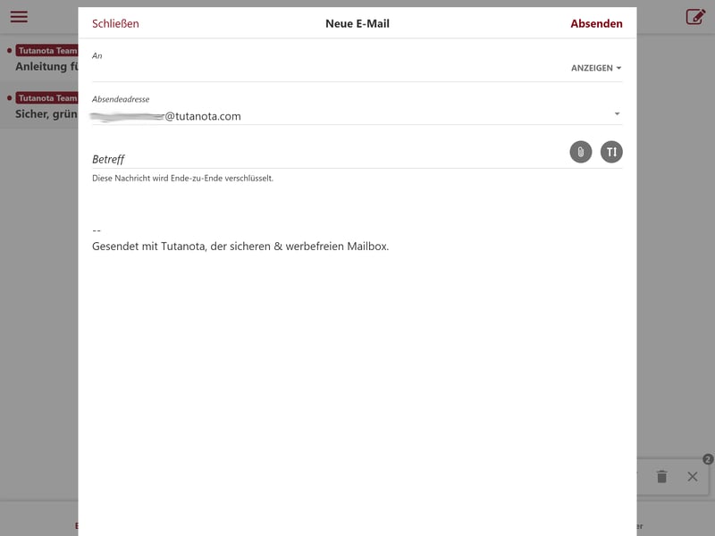 Tutanota ist eine sichere, quelloffene E-Mail-Lösung mit Ende-zu-Ende-Verschlüsselung. Im Gegensatz zu mailbox.org setzt Tutanota nicht auf den PGP-Standard, sondern eine Kombination aus AES (mit einer Schlüssellänge von 128 Bit) und RSA (mit 2048 Bit).