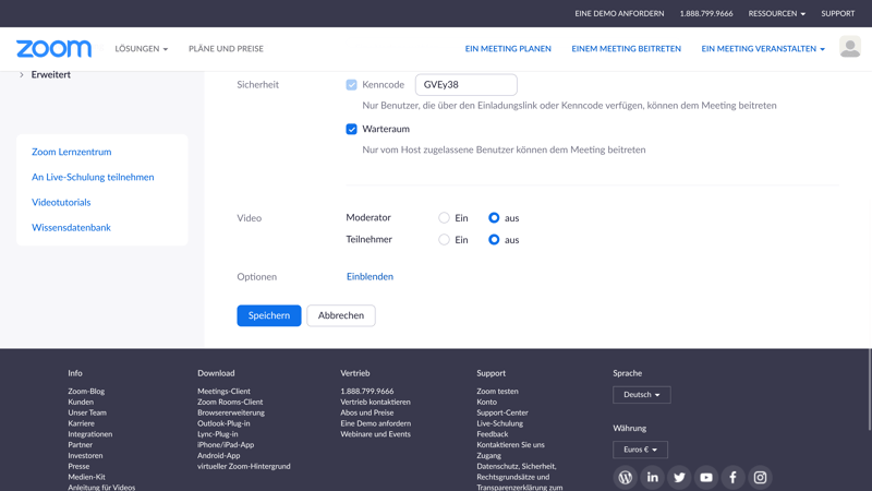 Ein Gespräch mit einer anderen Person ist bei Zoom auch gratis möglich. Hat man ein größeres Team, so kann man immerhin mit bis zu 100 Teilnehmern konferieren, allerdings nicht länger als 40 Minuten. Die notwendigen Einstellungen, um die DSGVO zu erfüllen und seine Daten zu schützen, sind allerdings nur mit einem kostenpflichtigen Account möglich. Auch sollte man darauf achten, dass alle Konferenzteilnehmer die aktuellste Zoom-Version nutzen.Serverstandort in der EU wählen