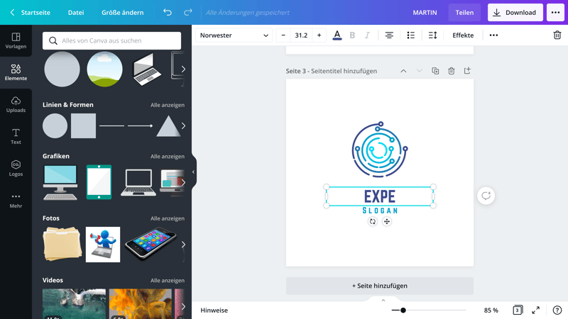 In dieser Komplexität liegt aber auch die Stärke von Canva. Zwar ist gestalterisches Talent etwas wichtiger als bei anderen Programmen, dafür werden Sie mit mehr Freiheit belohnt. Auf der intuitiven Drag-and-Drop-Oberfläche können Sie alle Elemente umfangreich bearbeiten, Effekte hinzufügen und sogar eigene Inhalte hochladen. Als einziger Logo Maker in unserem Test bietet Canva auch animierte Logo-Designs.
