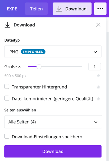 Pro-Kunden stehen weitere Download-Einstellungen zur Auswahl: Sie können die Größe festlegen (von 250x250 px bis 1.500x1.500 px), das Logo mit transparentem Hintergrund herunterladen oder die Datei komprimieren, was jedoch eine geringere Qualität bedeutet.