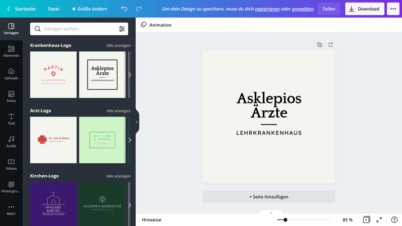 Templates gibt es aber auch hier: Im Menü links, wo Sie zwischen den verschiedenen Editor-Funktionen wechseln, finden Sie ganz zu Beginn den Auswahlpunkt „Vorlagen“. Hier hat Canva eine ganze Menge an Design-Vorlagen für Sie zusammengestellt, die nach Branchen sortiert sind. Es gibt beispielsweise „Krankenhaus-Logos“ und „Essen/Trinken-Logos“ oder auch weniger typische Kategorien wie „Kirchen-Logos“ oder „DJ-Logos“. Vorlagen für animierte Logos gibt es ebenfalls – die sind uns bisher in keinem anderen Logo Maker untergekommen.