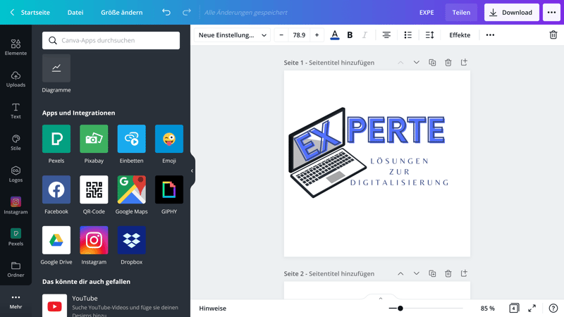 Praktisch: Wenn Sie bereits Logos besitzen, können Sie sie einfach bei Canva hochladen und dort im Editor bearbeiten. Unterstützt werden PNG, SVG und JPG-Dateien. Darüber hinaus gibt es Integrationen von Drittanbieter-Apps, beispielsweise auch von Stockfoto-Anbietern wie Pexels oder Pixabay. Geben Sie jedoch Acht, ob Sie Grafiken und Fotos von dort rechtlich auch für Ihr Logo verwenden dürfen.