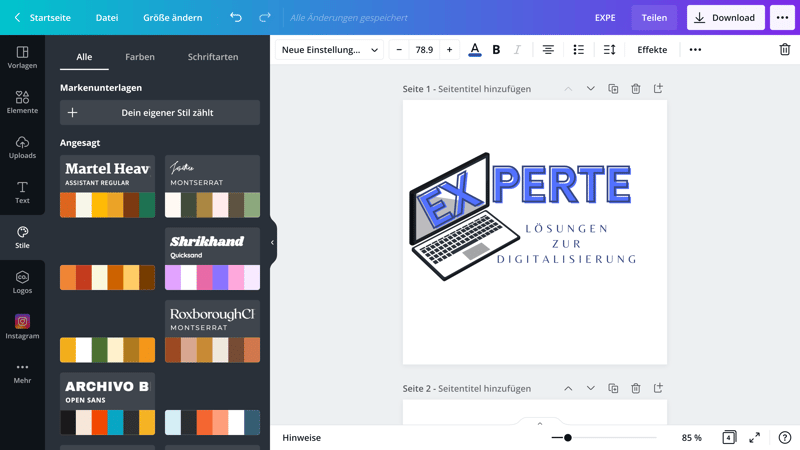 Praktisch ist auch die Funktion „Stile“. Durch die – verglichen mit anderen Logo Makern – Komplexität des Canva-Editors gibt es zwar nicht die Möglichkeit, für jedes Template verschiedene automatische Layouts auszuwählen, dafür können Sie voreingestellte Farbkombinationen auf Ihr Logo anwenden. Sie können Ihre Markenfarben auch speichern, damit Sie sie künftig automatisch auf andere Grafiken anwenden können.