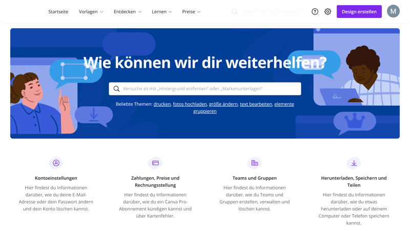 Das Canva-Hilfezentrum liefert Schritt-für-Schritt-Anleitungen, komplett in deutscher Sprache.