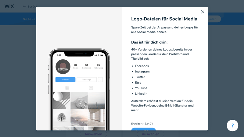 Wenn Sie nur am Logo interessiert sind, also keine Website dazu kaufen möchten, gibt es bei Wix wie erwähnt zwei Tarife: Basic und Erweitert. Schon ersterer gibt Ihnen für Ihr Logo alle kommerziellen und nicht-kommerziellen Nutzungsrechte, und liefert acht hochauflösende PNG-Dateien. Letzterer legt 50 Vektorgrafiken, 40 Social Media Logos und einen Brand-Guide oben drauf.
