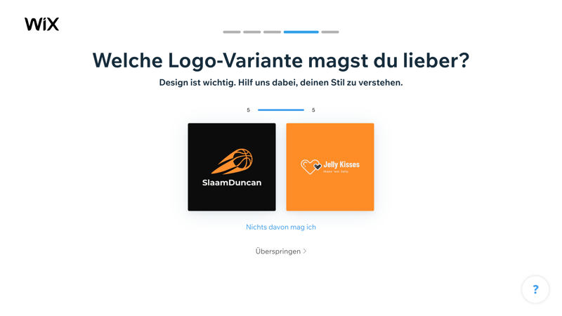 Im nächsten Schritt führt Ihnen der Logo Maker von Wix fünf Paare Beispiel-Logos vor, unter denen Sie jeweils Ihren Favoriten wählen, oder angeben können, dass Ihnen keines davon gefällt. So bekommt die Wix-Engine einen besseren Eindruck Ihres Geschmacks.
