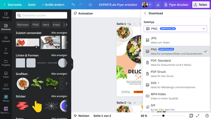 Die Wahl des Formats hängt davon ab, was Sie mit dem Flyer vorhaben. Soll er in den sozialen Medien geteilt werden, wählen Sie ein schmales .jpg oder .png. Soll er in den Druck, ist das Format abhängig von den Anforderungen der Druckerei. PNG ist heute durchaus üblich, wobei Sie bei diesem Dateiformat auch noch die Auflösung vor dem Download wählen können. Je höher diese ist, desto größer ist allerdings auch die Datei.