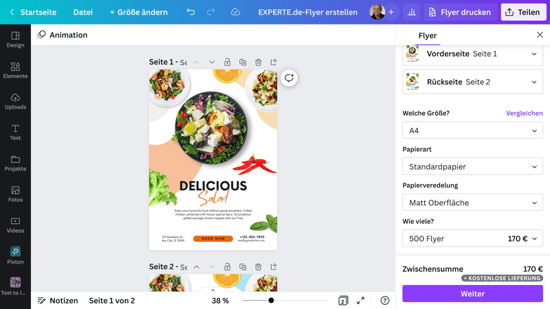 Wer kostenlose Flyer für private Zwecke benötigt, kann seine fertigen Werke direkt am heimischen Drucker produzieren. Benötigen Sie die Flyer geschäftlich, empfehlen wir jedoch, die Herstellung einer professionellen Druckerei zu übergeben. Die hauseigene Option von Canva ist recht teuer, doch Sie finden sicherlich günstigere Onlinedruckereien als Alternative.