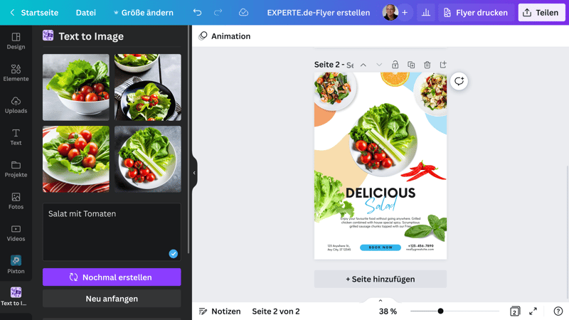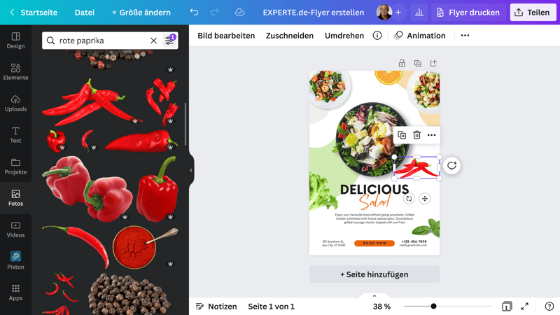 In unserem Beispiel haben wir nach Salat mit Tomaten gesucht, eines der gelieferten Motive in die Mitte des Flyers gesetzt und den Hintergrund entfernt.