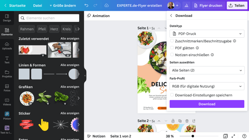 Wenn das Layout passt, alle Bilder und Grafiken gefallen, die Schriften gut lesbar und keine Fehler mehr im Text zu finden sind, geht es an den Download. Bei Canva finden Sie die Optionen dafür oben rechts unter dem Menüpunkt Teilen.