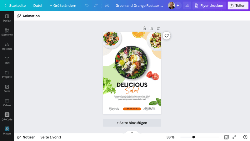 Haben Sie sich für ein Wunschlayout entschieden – in diesem Fall haben wir einen Restaurantflyer gewählt – öffnet Canva die Vorlage in seinem hauseigenen Editor.