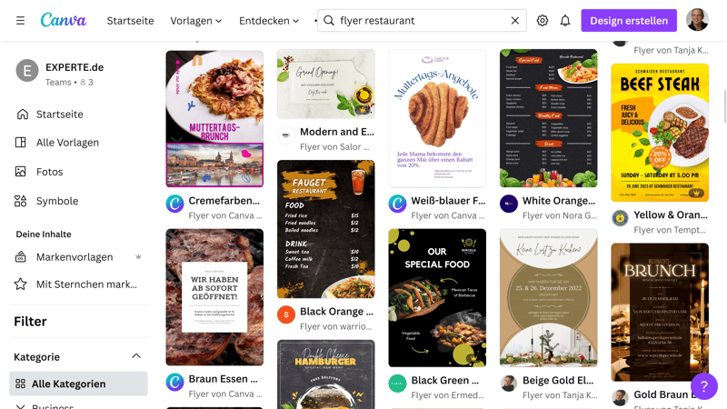 Bei Canva führen mehrere Wege zu den Vorlagen, die nach Einsatz und Themen sortiert sind.