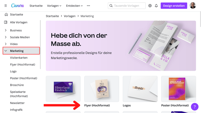 Canva sortiert alle seine Vorlagen thematisch nach Verwendungszweck. Um nach einem passenden Layout für Ihren Flyer zu suchen, klicken Sie entweder oben im Hauptmenü auf Design Spotlight und wählen aus den sich öffnenden Untermenüs Flyer aus. Oder Sie klicken links auf das Thema Marketing und dann Flyer (Hochformat).