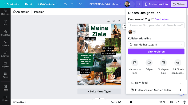 Digital können Sie es auch als Handy- oder Laptophintergrund nutzen. Wenn Sie extrovertierter sind, können Sie Ihr Visionboard auch auf sozialen Medien wie Pinterest teilen. Bei Canva haben Sie über den Button die Auswahl für alle Optionen.