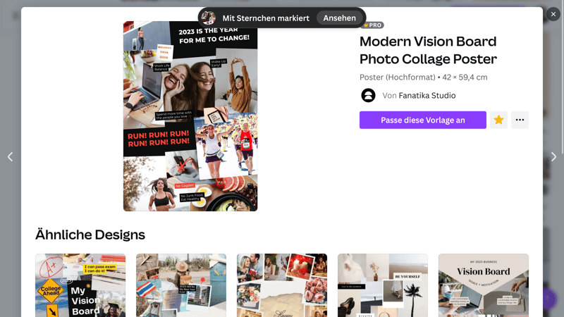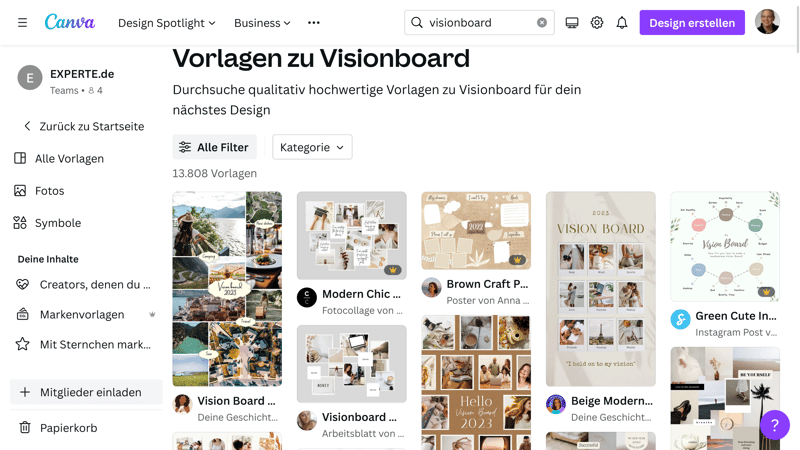 Der schnellste Weg zu den Visionboard-Vorlagen führt über die Suchmaske. Canva listet tausende Vorschläge auf, aus denen man die passende wählen kann.