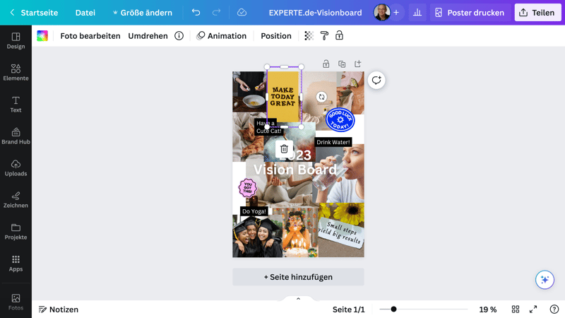 Im ersten Schritt passen wir die Daten des Visionboards an unsere Vorstellungen an. Mit Drag-and-drop können Sie alle Elemente der Vorlage verschieben, ersetzen oder löschen.
