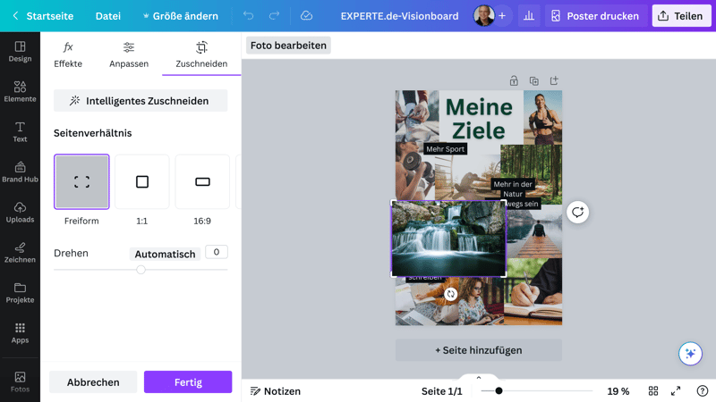 Im Anschluss tauschen wir die Vorlagenbilder aus. Entweder Sie nutzen eigene Fotos und Grafiken oder die riesige Canva-Bildbibliothek, die Ihnen in der Pro-Version zur Verfügung steht. Die Bilder können Sie direkt im Rahmen passend ziehen. Außerdem steht Ihnen nach einem Doppelklick auf das Bild ein spezieller Editor zur Verfügung, mit dem Sie Effekte hinzufügen, Bildparameter ändern und sogar intelligentes Zuschneiden per KI auswählen können.