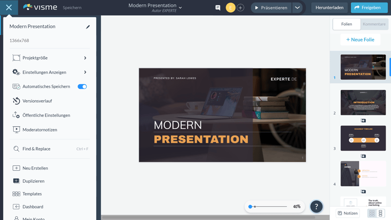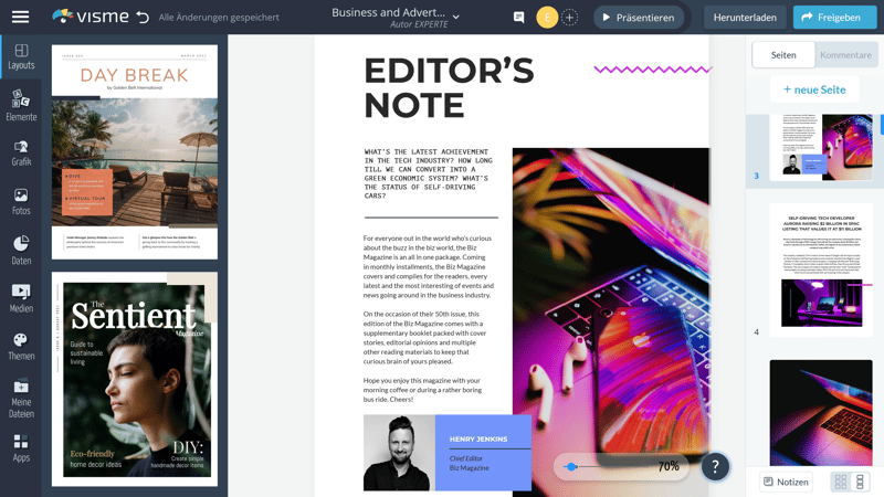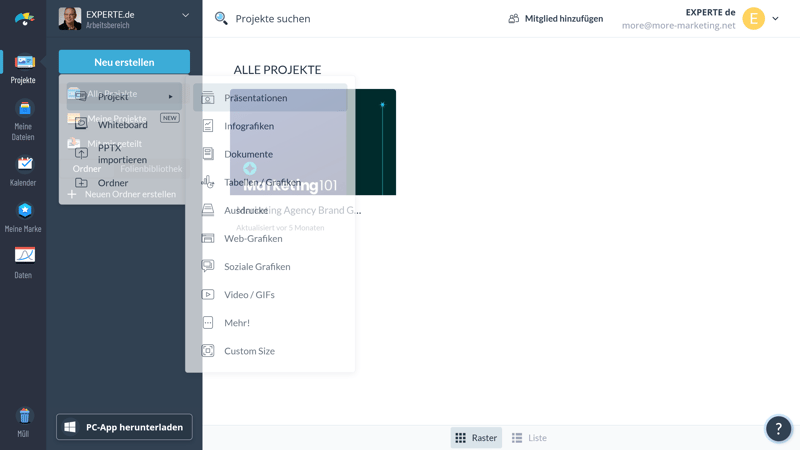 Bei Visme kommt man über verschiedene Ebenen zum neuen Layout.