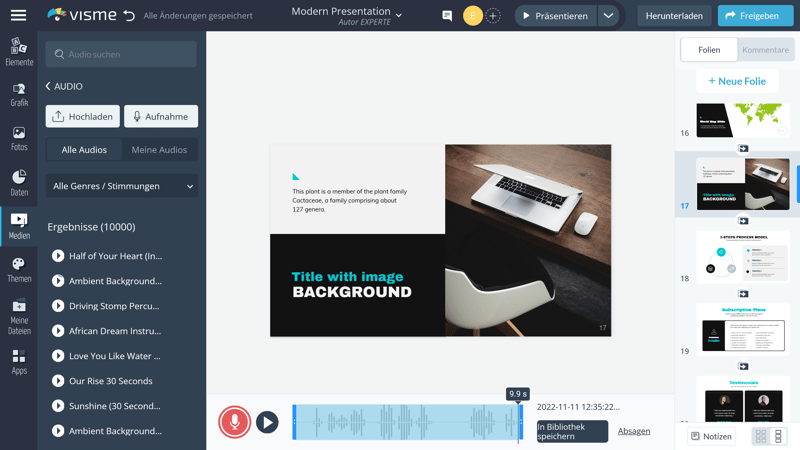Auch lassen sich Videos von Plattformen wie YouTube, Vimeo oder Wistia einbetten. Wenn Sie Audiodateien hinzufügen möchten, können Sie aus einem reichen Fundus an Musikstücken wählen, eigene Dateien uploaden oder auch direkt eine Aufnahme starten, was in unserem Test reibungslos funktionierte.