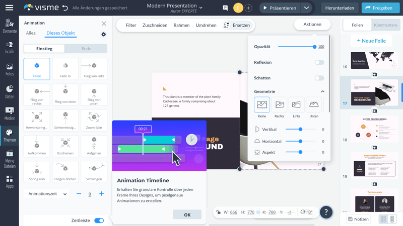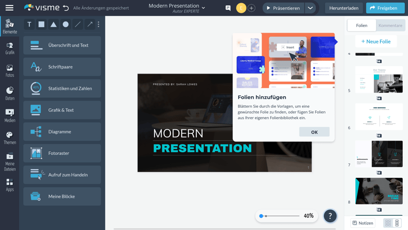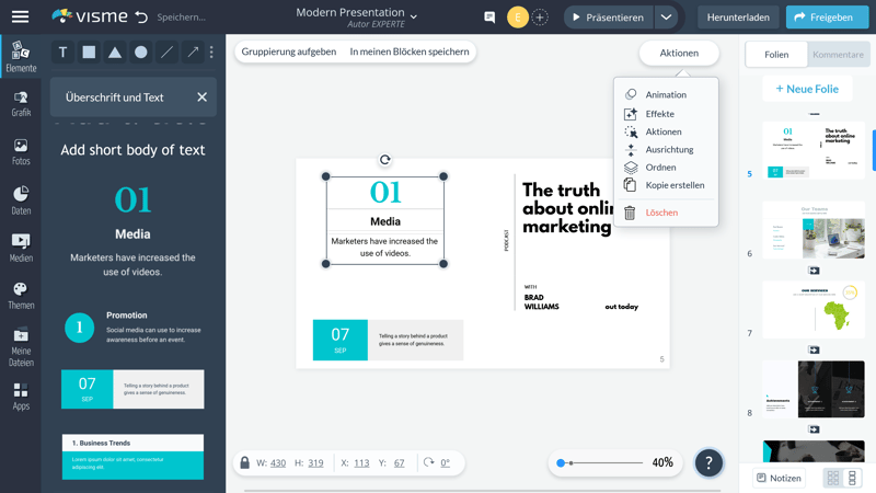 Im Editor selbst findet man sich nach einer gewissen Einarbeitungszeit gut zurecht. Im linken Bildschirmbereich befinden sich alle Gestaltungswerkzeuge, auf der Seite die Folienübersicht und im oberen Part die Informations- und Weiterverarbeitungsleiste.