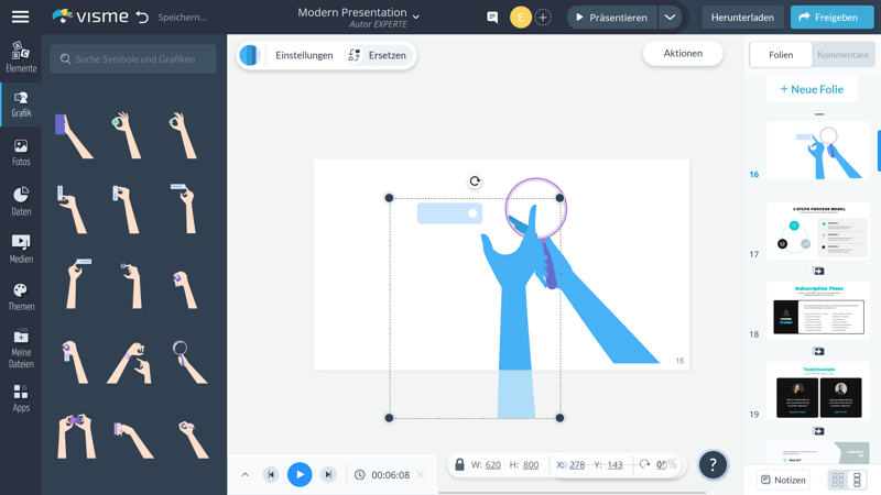 Im Menü Grafik finden sich reichlich Icons und sogar animierte Illustrationen, inklusive Gesten und 3D, für alle möglichen Einsatzgebiete. Gerade für die Erstellung von Erklärungs-Präsentationen sind diese sehr gut geeignet.