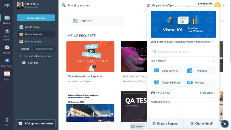 Visme ist bei weitem nicht so intuitiv zu nutzen, wie manch andere Programme. Hier kommt das kleine Fragezeichen unten rechts gelegen, das einen auf jeder Seite begleitet: Per Klick erreichen Sie einen Support-Bereich – der allerdings nur auf Englisch verfügbar ist.