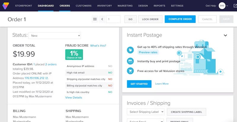 Hier sollten Sie alle Funktionen auf einen Blick sehen und alle weiteren Schritte veranlassen können – Versand, Tracking-Nummer, Rechnung ausdrucken etc. Manche Anbieter weisen hier auf verdächtige Bestellungen hin; der Fraud Score von Volusion ist in dieser Hinsicht besonders umfangreich.