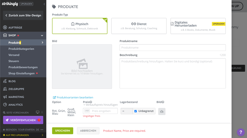 Sie sind auf physische Produkte beschränkt: Der Verkauf digitaler Produkte ist bei Weebly nur in den Bezahltarifen möglich.Fehlende Features