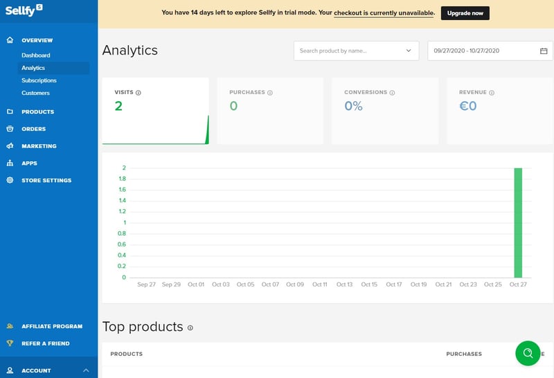 Statistiken finden Sie unter Overview > Analytics. Hier erwarten Sie Besucher- und Verkaufsstatistiken sowie die Konversionsrate und Ihre Gesamteinkünfte. Außerdem können Sie Ihre Bestseller im Blick behalten und auf einen Blick sehen, wie viel Ihnen jedes Produkt eingebracht hat. Weiter können Sie feststellen, wie Besucher auf Ihre Shop-Website gelangt sind und woher sie kommen.