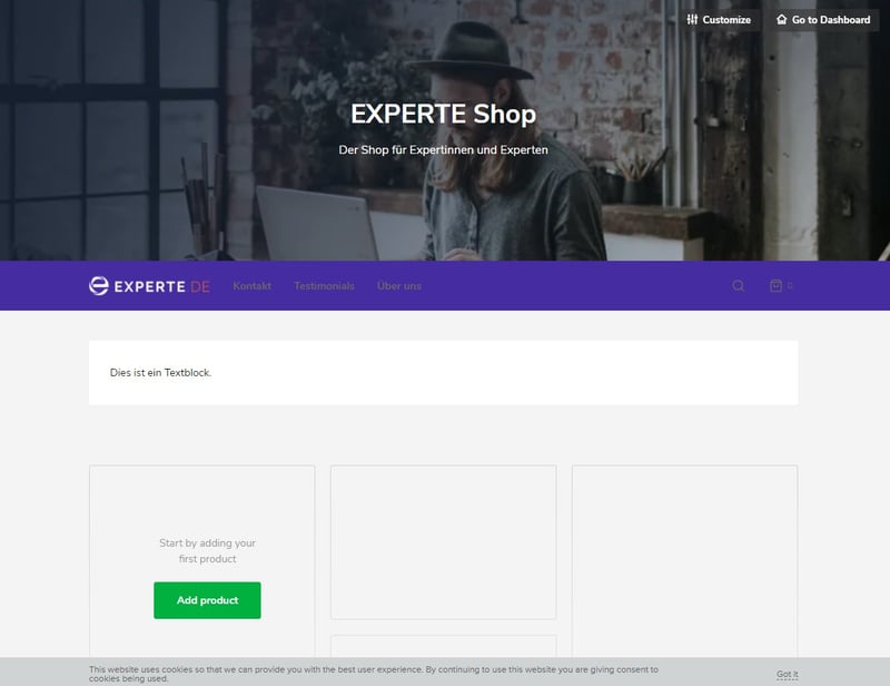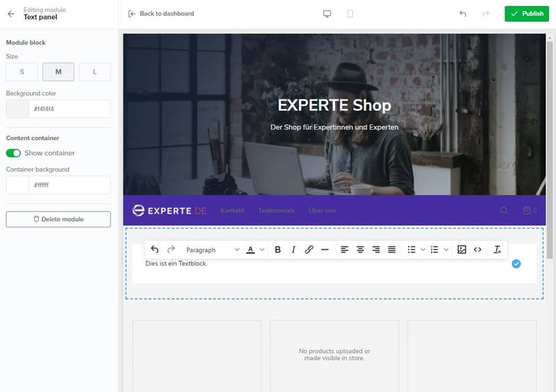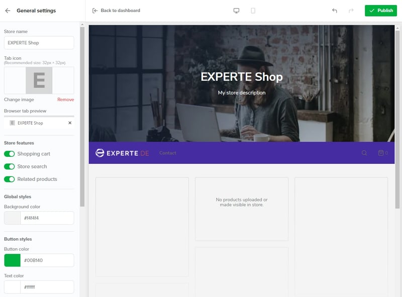 In der oberen Menüleiste können Sie zwischen der Web- und mobilen Ansicht wechseln, um zu überprüfen, wie Ihre Seite an verschiedene Formate angepasst wird. Mit einem Klick auf Publish daneben veröffentlichen Sie Ihre Änderungen, woraufhin Sie direkt einem Link zur fertigen Website folgen können. Dort können Sie wie ein Besucher durch Ihre Seite navigieren, gelangen aber über Buttons auch direkt zurück ins Dashboard, beispielsweise um neue Produkte hinzuzufügen.