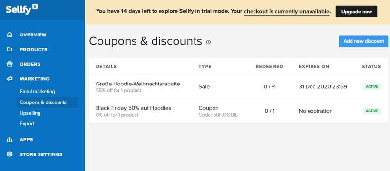 Natürlich können Sie Ihre Kunden auch mit Rabattcodes überraschen oder ganze Artikel heruntersetzen (wenn Sie ganze Kategorien günstiger anbieten möchten, müssen Sie leider alle Produkte einzeln auswählen). Unter Coupons & Discounts sind neue Rabatt-Coupons und Discount-Aktionen schnell eingerichtet.