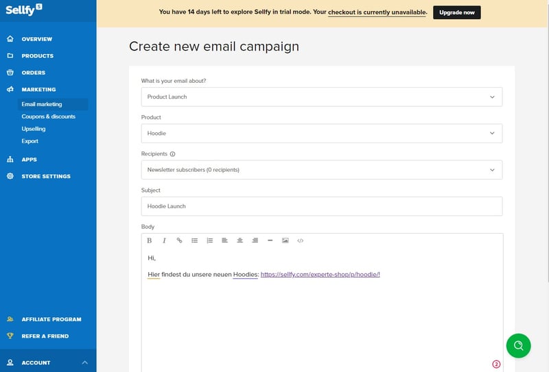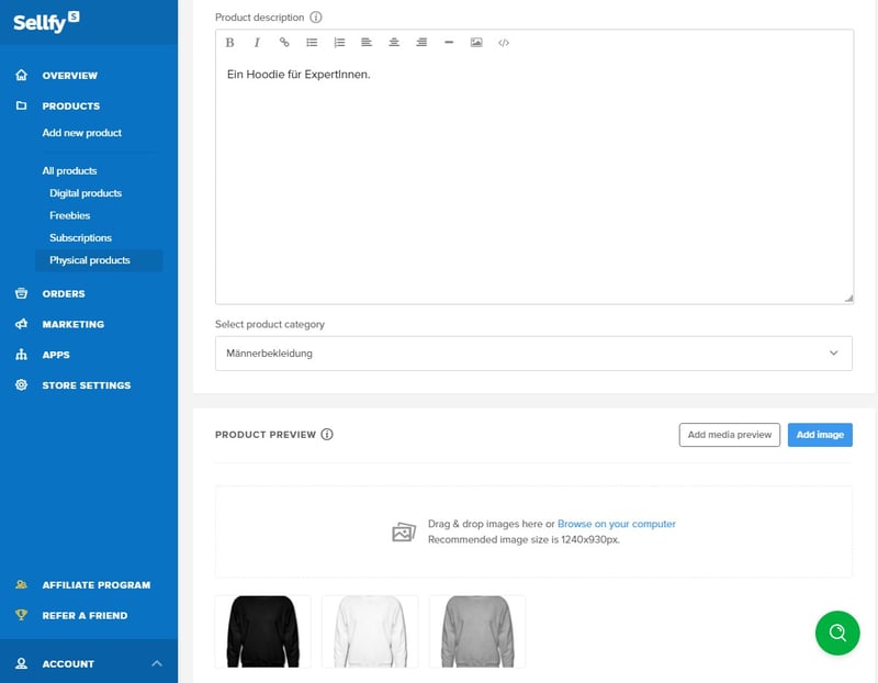 Obwohl das Sellfy-Dashboard nur auf Englisch verfügbar ist, können Sie auch deutsche Online-Shops erstellen